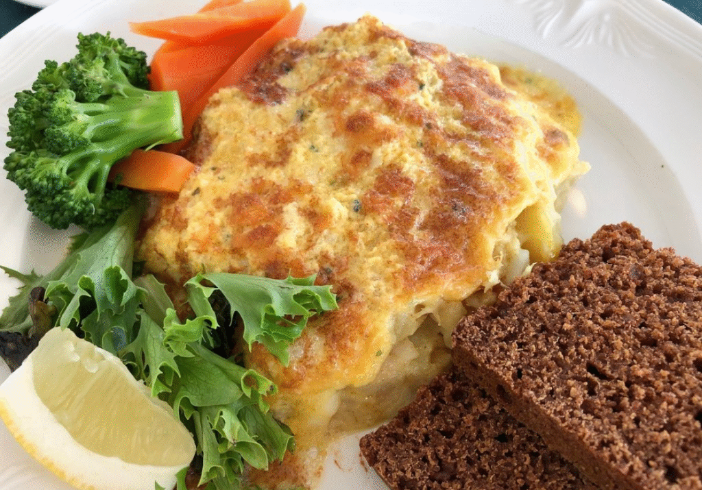 A heartwarming and traditional Icelandic comfort food, Plokkfiskur is celebrated in the third image. It’s a creamy, baked fish gratin often made with haddock or cod, potatoes, béchamel sauce, and a golden cheese crust. Served with rugbrauð (dense rye bread) and fresh greens, it’s a rustic, nourishing dish that evokes the spirit of Icelandic home cooking.
