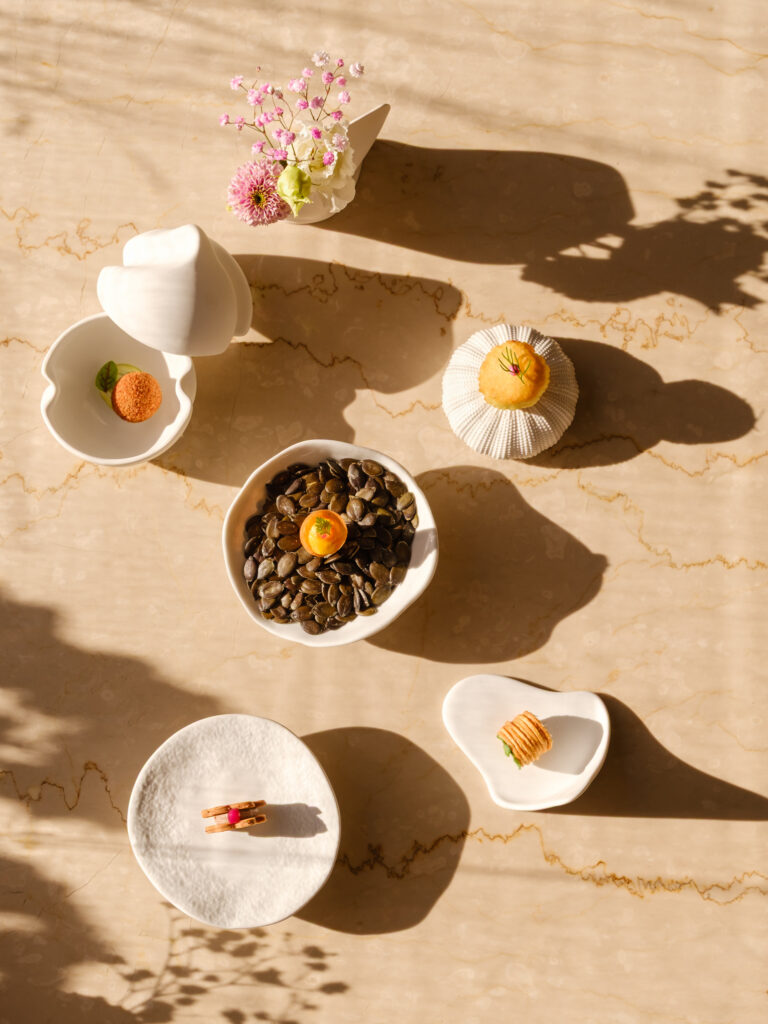 The second image presents OiO’s poetic amuse-bouches — a curated still life of textures and colors. Each bite-sized piece, arranged in custom porcelain bowls, captures the spirit of Italian craftsmanship and modernist plating. From crisp pastry filled with pumpkin cream to herbaceous petits fours, these creations blur the line between culinary design and sculpture.