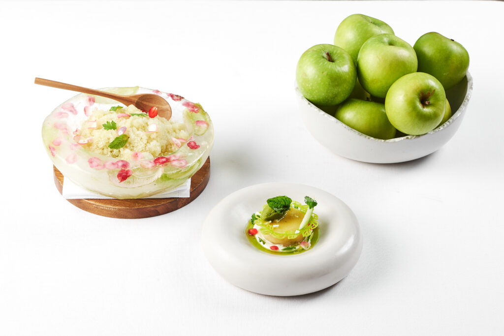 The journey often begins with a refreshing apple-inspired creation. A delicate granité infused with apple essence and garnished with pomegranate seeds is served in an ice bowl adorned with petals—an edible sculpture in itself. Alongside it, a meticulously plated apple variation with herbs and crisp textures delights both the eyes and palate.